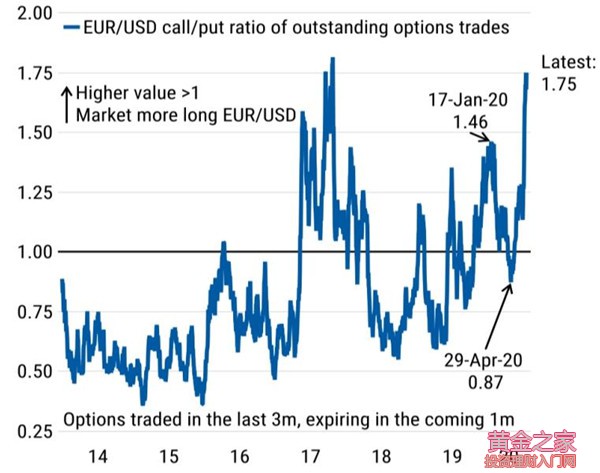 (2) EUR多倉并未大幅增加:期權市場EUR多倉和空倉比率僅略微增加,看漲/看跌期權比率從1.64升至1.75;期貨交易者同樣僅小幅增加EUR/USD的多倉,未平倉合約增幅約0.9%;盡管情緒指標的樂觀程度升溫,但仍低于6月10日的高位。歐元未受到股市虹吸效應助力。市場對歐元區股票的興趣似乎迅速淡去,美國投資者也在近幾周賣出歐元區股票 附圖:EUR/USD 看漲/看跌期權比率 來源:摩根士丹利