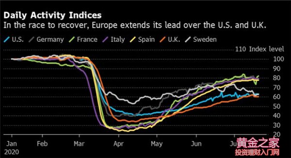 歐元區經濟復蘇強度遠超美國 自1992年以來,美國的經濟表現在大部分時間內優于歐元區。即便是在金融危機爆發次年的2009年,美國2.5%的GDP收縮幅度同樣遠優于歐元區4.5%的GDP萎縮。邁入2020年,資本世界永不熄滅的“黃金燈塔”,卻在新冠疫情沖擊之下逐漸黯淡。 自5月起,美國過早重啟經濟引發的二次疫情,嚴重阻礙了該國的經濟復蘇。而在歐洲,許多此前的新冠重災地區成功恢復了經濟活動,而沒有造成類似美國的病例激增。