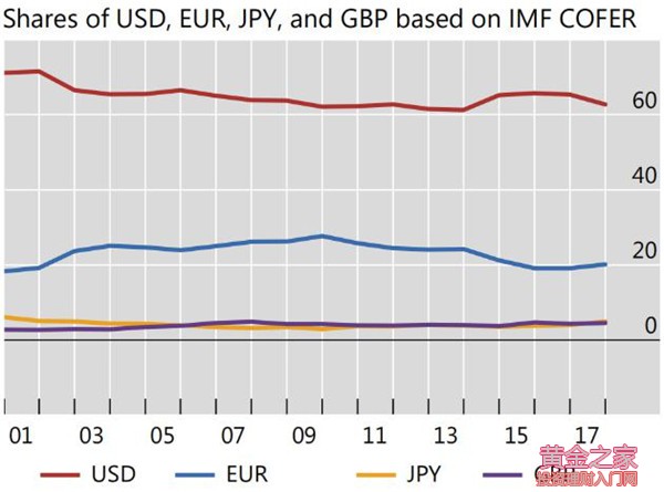 當然,即便美元霸權開始凋零,也將是一條漫長的下坡路。 國際清算銀行(BIS)2019年發布的三年一度的調查顯示:在全部的貨幣交易中,有88%都使用了美元,美元在全球外匯儲備中的占比高達62%,雖較1970年代85%的峰值有所下滑,仍遠高于歐元20%的占比。 附圖:全球儲備貨幣占比 來源:IMF、BIS