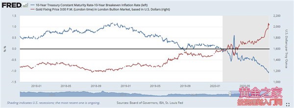 招商證券:實際收益率低企是金價主要推手 黃金短期價格影響因素中,金融屬性>避險屬性>商品屬性。年初以來在寬松貨幣環境下,名義利率持續維持低位同時,通脹預期的提升導致實際利率預期下降至近20年低點,是今年黃金價格的主要推手。 附圖:金價vs實際利率(10年期國債收益率-10年期盈損平衡通脹率) 來源:Board of Governors, IBA, St. Louis Fed
