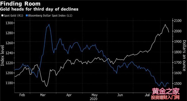 高盛:貨幣貶值和實物需求或推漲黃金至2300美元 高盛大宗商品首席策略師Jeffrey Currie:金價漲幅遠超真實利率攀升的幅度。美元貶值是關鍵因素,市場對美元信心動搖主要基于對未來通脹上升的擔憂,在地緣政治局勢緊張、美國國內政治和社會局勢不穩定以及第二波新冠疫情席卷全美的大背景下,市場擔心美聯儲未來可能會容忍更高的通脹。 附圖:金價vs彭博美元現貨指數 來源:Bloomberg