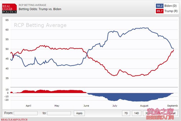 川普絕非毫無勝算 “Money never lies”,金錢永遠不會說謊。 以民調論,特朗普幾乎全無勝算。拜登當下的搖擺州選情遠好于2016年的希拉里。但將賭場賠率做換算,特朗普連任的概率已從7-8月不到40%的低谷,悄然回升到了49.7%。 附圖:以賭場賠率換算特朗普(紅)、拜登(藍)競選成功率 來源:Realclearpolitics.com