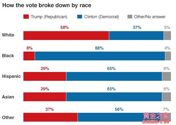 在2016年大選中,特朗普僅獲得了8%的黑人票和29%的拉丁裔、亞裔票。但在白人群體中,特朗普58%的得票率遠超希拉里37%得票率,憑此奪得總統寶座。 自始至終,特朗普的競選戰略非常明確,即“得白人者的天下”。 附圖:2016年總統大選不同人種票數分布 來源:BBC