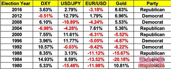 具體來看,在過去10個大選年的10-12月間,國際黃金價格收漲月份的占比為10/30,美元指數收漲月份的占比為19/30?偨Y歷史規律,美國大選的不確定性并不易引發大規模的資產避險從而提振金價;美國大選前后的美元傾向于走強。
