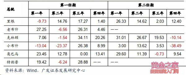 (2)美股: 市場歷史學家耶魯·赫希提出過一個爭議較大的總統周期理論(Presidential Election Cycle Theory)。根據該理論,新總統當選后的第一年,股市可能陷入停滯。第二年,股票的表現逐漸好轉,第三年和第四年的回報率最高。 從上世紀80年代以來,美股下跌的年份只發生在每位總統第一任期的第一、二年以及第二任期的第七、八年。 附圖:80年代以來歷任美國總統任內標普500指數年度收益率(%) 來源:廣發證券
