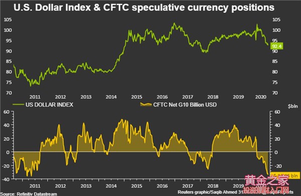 附圖:美元指數(上)與CFTC美元倉位(下) 來源:Refinitiv Datastream