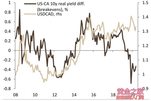 (2) 瑞銀對CAD基本面看法更為積極,USD/CAD年底或回落至1.25:認為CAD的中期宏觀驅動因素已經更為積極。美國-加拿大實際利率周期已經改變,實際利差利好CAD,原因在于加拿大在上一輪周期中,成功觸及通脹目標。與美聯儲相比,加央行容忍通脹超出目標的意愿更弱。 附圖:美國-加拿大實力利率利空USD/CAD 來源:彭博,瑞銀
