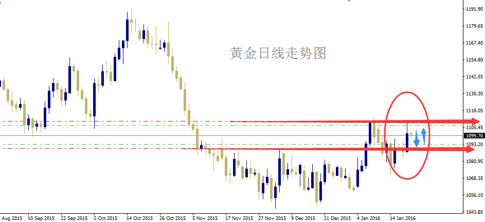 | 行情回顧: 黃金價格周三美市盤中延續日內強勢,成功上穿1100關口后暫時企穩,今日亞洲股市和歐洲股市全線下滑,美股也大幅低開,避險資金繼續支持黃金價格上揚,刷新1月11日來高點至1109.10美元/盎司。最高價格沖至1109.5,已經刷新了兩周以來的高點,但上面還有1113的高點阻力,所以行情還算不上真正的看漲。或者換個角度來看,黃金價格這是震蕩上升而不是單邊,否則上周五開始的反彈,就不會等到周三才延續上升,而且是在周二形態并不好的情況下漲。 日線方面沖高回落下來,今天不會有昨天那樣的連續性上漲行情,但日線支撐還是存在,預計在突破1113前高之前還有震蕩過程,支撐方面看1092-95區間,阻力則位于1108-1113區間。黃金總體在區間內進行高沽低渣,只要不追單操作問題不大,多頭有日線支撐不構成大跌,空頭則有昨天高點和前高壓制,日線收不好同樣不會大漲! |