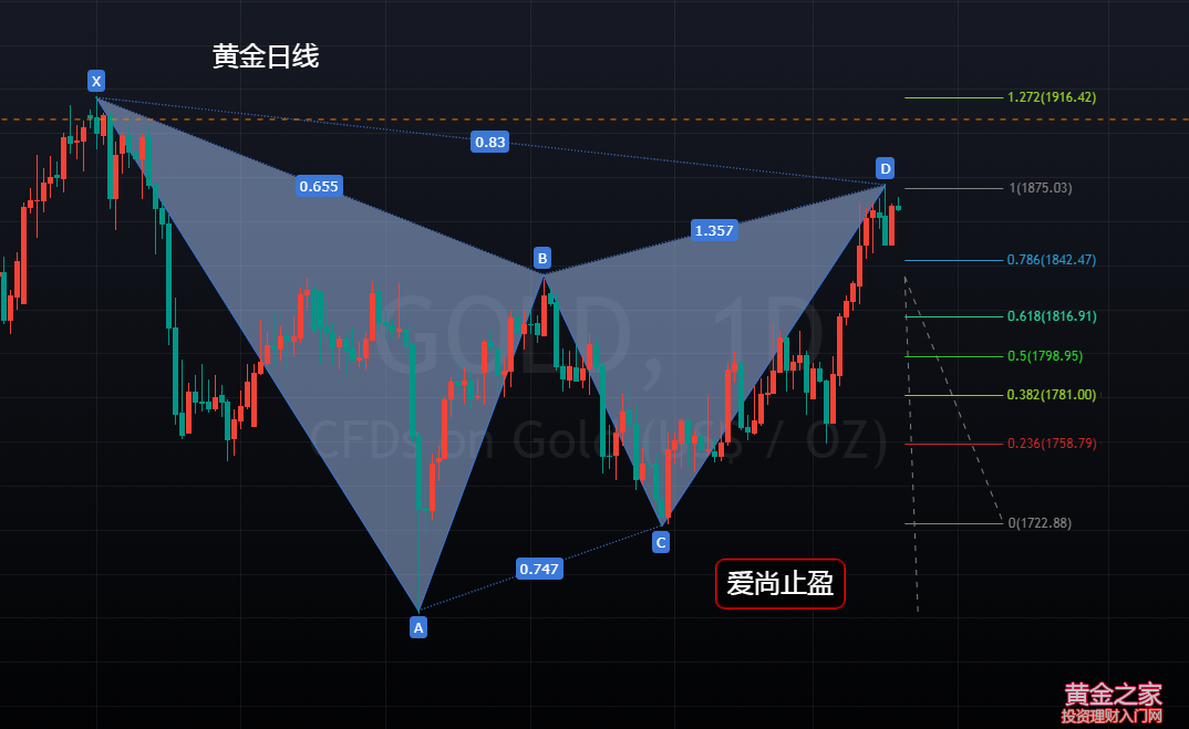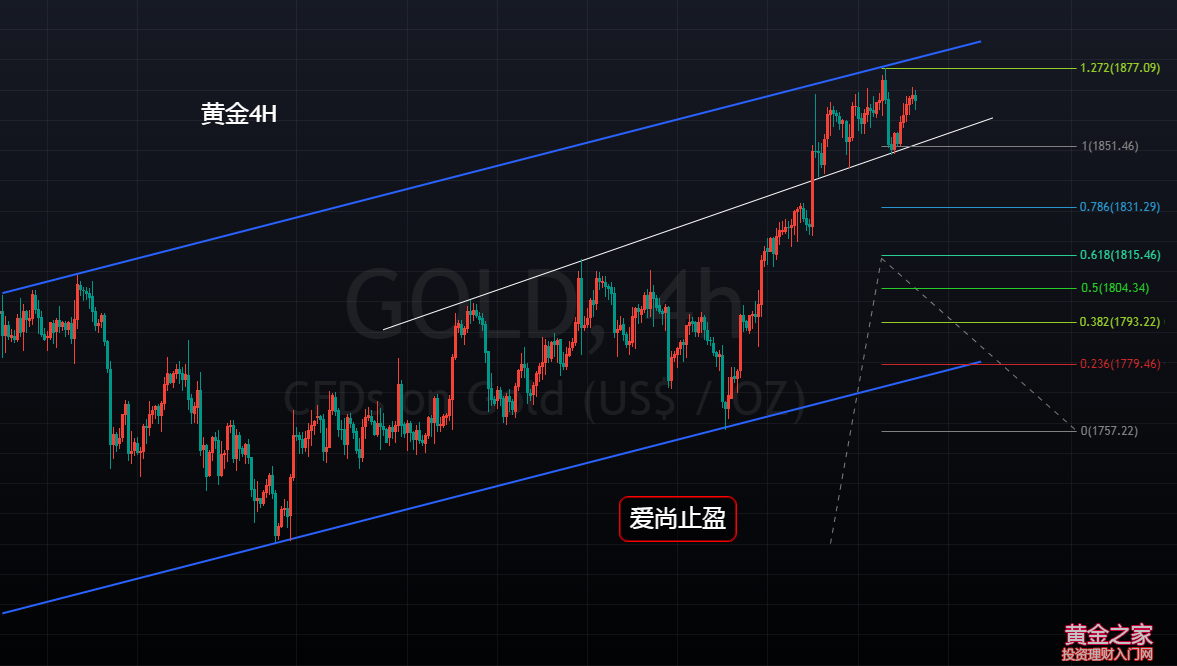 黃金,在月初回踩1759支撐后開始一路連陽上升,上周強勢突破日線雙頂壓制1834后,金價一直處于1840之上高位震蕩修正,周二金價在觸及1877一線后,受到4小時上升通道上軌壓制后展開回落,周三在觸及4小時上升趨勢線支撐1849后拉升,當前金價再次來到1870附近,此輪多頭,近120美金的漲幅,價格也觸及日線級別的關鍵阻力位附近,至于浪3是否結束,這里還是得打一個問號,對于交易而言,肯定是不建議在高位接多,黃金隨時都可能迎來浪4的調整,別為了芝麻丟了西瓜。 1680-1834,日線級別浪1的第一波上升,154美金的漲幅;1721-1877,日線級別浪3的上升浪,156美金的漲幅,就幅度而言,符合AB=CD形態,但在時間周期上,相差了近一倍,對于日線級別AB=CD做空形態而言,持保守觀望的態度;細分到4小時,如果把1721視為浪1的起點,1721-1813有92美金的漲幅,而浪3的起點1759到目前的高點1877有118美金的漲幅,用斐波那契擴展我們可以計算出當前的高點1877一線剛好是浪1的1.27倍,幅度符合AB=CD形態里的變形形態,但同樣,在時間周期上存在差異,所以,對于浪3是否見頂,還是有爭議,但日線已經形成了Gartley做空形態,日線級別,已經符合做空的條件,1877也將有望成為短期階段性的高點。 1877一線,也是4小時上升通道上軌壓制,金價在觸及此位后走了一波有效回撤,彰顯出此壓力位的有效性,而此輪的回撤也使得日線在周二收取了一根上影線極長的大陰,配合前一個交易日收取的吊頸線,短期黃金有見頂的跡象,所以,今日黃金,可以依托1877阻力位去嘗試波段空單,上破1878止損出局即可,下方短期支撐關注4小時趨勢線支撐及昨日低點1852-49,強支撐關注此輪上升回撤的0.382支撐1832,此位也是本月的多空分水嶺,本周首次觸及1832附近可以多一次,若有效跌破1832支撐,波段空頭將有望成立,第一目標將看至1800區域。 操作建議: 1870附近空,止損1878,短期目標看1860-50-32,中期目標1800 |