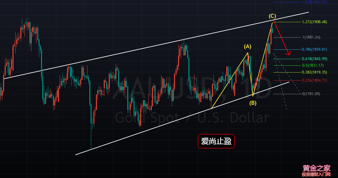 黃金,在春節(jié)前自1855開始大幅回落,最低觸及1780附近后,受到日線及4小時趨勢線支撐開始走連陽走反彈,1780支撐的關(guān)鍵性,在春節(jié)前就已經(jīng)作出了預(yù)判,1780附近的多頭,我們也拿了個波段,但目標僅僅只看到了1840,近60美金的利潤,現(xiàn)在看來,格局還是小了。 在近期技術(shù)面與俄烏沖突的雙重背景下,早間黃金突破了1900整數(shù)關(guān)口,此位的突破,算是擊垮了近期逆勢空軍的心理防線,空頭不死,多頭不止,前面一路固執(zhí)做空的已經(jīng)死傷大片,等空頭死得差不多,多頭就將宣告結(jié)束了。 當(dāng)前黃金,上方阻力在日線趨勢線壓制1909附近,而1909,也是日線級別的諧波位。1722到1876,154美金的漲幅;1753到1909,也有156美金的漲幅,幅度上,基本符合AB=CD形態(tài)。(見下圖) 如果以1753為起點,1753到1854,101美金的漲幅;1780-1909,129美金的漲幅,幅度剛好是前者的1.27倍,也完全符合AB=CD的變形形態(tài)。(見下圖) 日線以前期高點1876為開跌口,1753及1780為起漲點,1909附近,剛好符合蝴蝶形態(tài)D點的做空位。(見下圖) 以1680為起點的上升5浪已經(jīng)基本完成,1909若能成為此輪多頭的拐點,后市將有望迎來空頭的春天。(見下圖) 技術(shù)面上,黃金已經(jīng)具備了中線做空的機會,目前存在最大的爭議,就是俄烏沖突。這場沖突,完全就是美麗國在自編自導(dǎo),畢竟目前的局勢下,只有烏俄真正開戰(zhàn)才符合美麗國的利益,才能將目前越來越抱團并不聽話的的歐盟綁在美國的戰(zhàn)船上,才能讓沒人要的美債找到接盤俠和冤大頭,進而解決目前美國經(jīng)濟困窘債臺高筑和通脹嚴峻的事實,進而保證總統(tǒng)寶座能得到連任。但是,主演俄國不傻呀,他非常清楚導(dǎo)演想做啥,而打烏國,對自身百害而無一利,沒有利益的戰(zhàn)爭,傻子才去碰。所以啊,我個人覺得,這場沖突,不會演變?yōu)閼?zhàn)爭,鬧劇結(jié)束了,黃金也該跌了,畢竟在美聯(lián)儲加息的大環(huán)境下,未來黃金的空頭趨勢是不會改變的。 操作建議: 黃金1909附近空,止損1918,目標看1854-1800破位持有 |