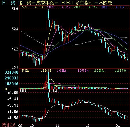 BBI指標(多空指標)這個指標想必有人知道,也使用過,它是用來判斷股票多空狀態的一個指標。多空的判斷有很多方法,股市中不少人喜歡用移動平均線來判斷,通過設定不同周期的移動平均線來尋找多空轉換的跡象,但是,這種方法并不能有效解決不同周期移動平均線互相協調的問題。而BBI多空指標的設計原理是綜合多個移動平均線的數值后,將它們進行平均處理,這樣得到的數值更客觀、更形象,因為它如同一個議會,是在綜合了大家的意見后得出結論,而不是單獨作出評判,所以,用“多空指標”來判斷多空的效果是比較理想,特別是在判斷中長期走勢的時候。BBI指標的使用方法很簡單,它只有一條參考線,當股價站在BBI指標線的上方,就說明這只股票正處于多頭趨勢,股價如果跌到了BBI指標的下方,就說明這只股票進入了空頭趨勢。由于BBI指標判斷多空的特性,對一些成長性較好的股票有特殊的指導意義,如果將該指標用在周線圖中會收到意想不到的效果。