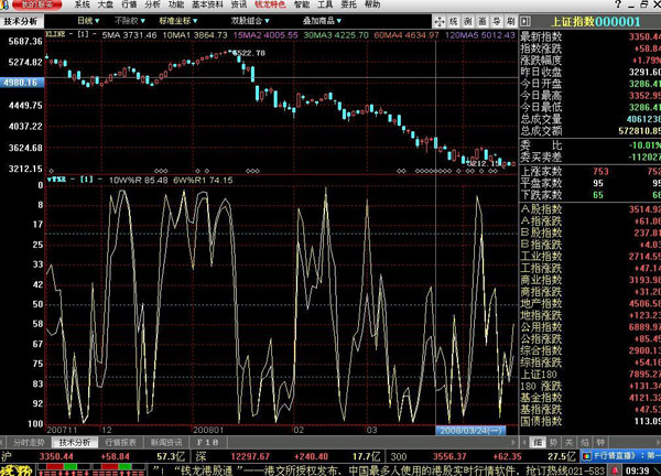 2、從威廉指標的計算公式看,基期n值的數值選擇非常關鍵。n值確立后,代表了研究周期的選定,n值越小,威廉指標波動頻率越快,把握價格變化的靈敏度就越高,但據此操作投資者易陷入頻繁操作的誤圈,偶然因素的影響也會加大投資者對現有市場的判斷出錯;n值越大,威廉指標波動頻率越慢,價格變化的靈敏度降低,偶然因素對價格趨勢的影響降低。筆者對威廉指標作了5年的長期跟蹤并結合時間之窗對價格趨勢的影響,淺顯認為威廉指標可按短、中、長選取參數,短期n值選10為宜,中期選20,長期選89。這樣威廉指標在5分鐘、15分鐘、30分鐘、60分鐘、日線、周線、月線圖上均表現為3條威廉指標線,分別代表了短、中、長的擺動趨勢。