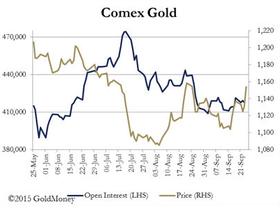 上周黃金市場出現了比較大的起伏,周初先是大幅走低,但此后受到避險需求推動大幅走高,一度觸及一個月高點。 在期金市場,黃金的未平倉合約數量有一些上漲,但這還不足以顯現黃金市場就此可以買入。 未平倉合約和金價之間的分歧自8月初就開始顯現,因此上周的上漲并不算新鮮。